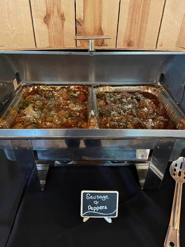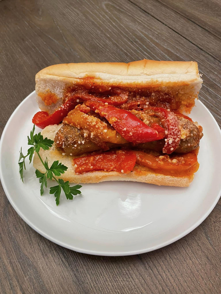 Pork sausage with bell peppers and onions in a light tomato sauce base. Served over rice. Feeds family of 2 or 4.